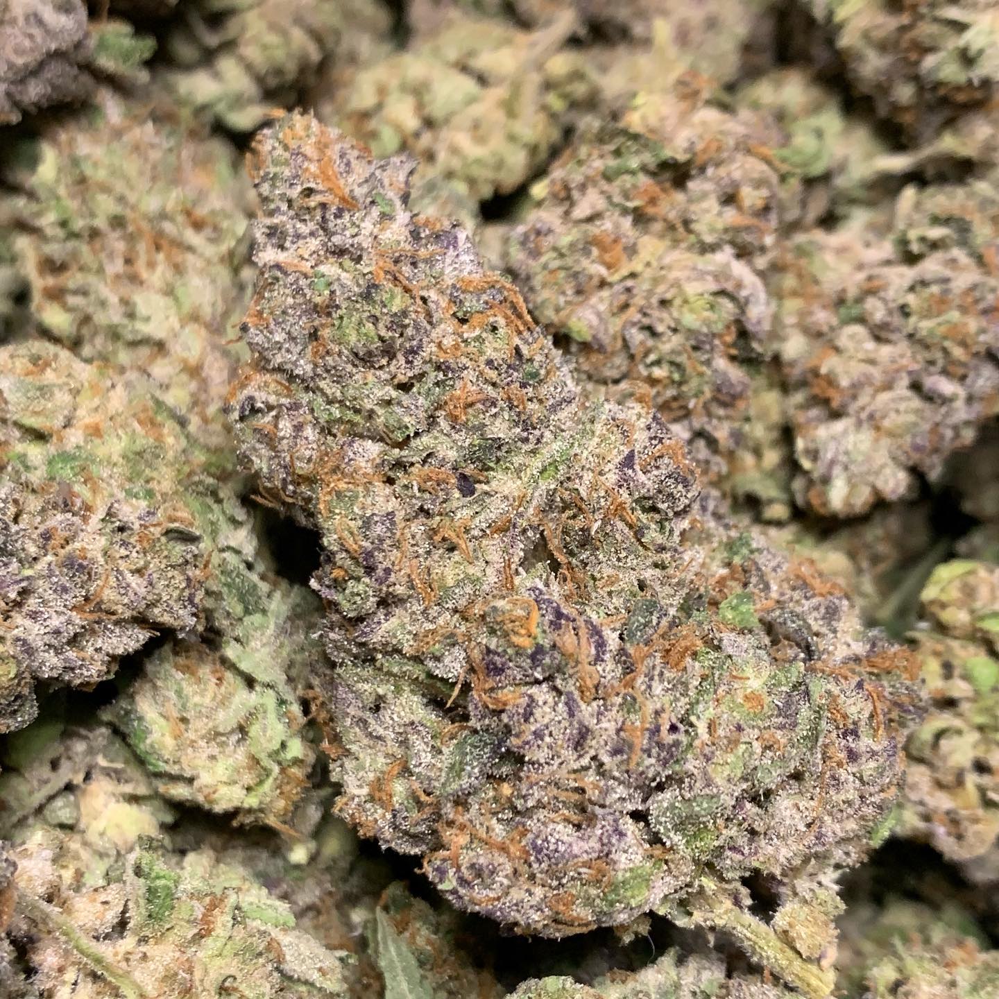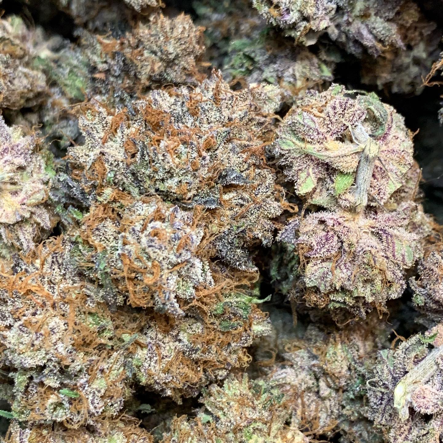 The buds are a striking green. Orange hairs weave through, and the surface is dusted with a layer of trichomes.